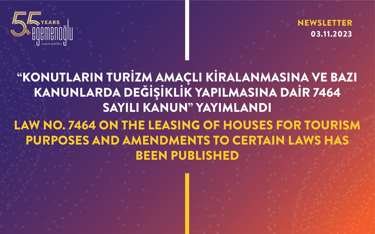 Published in the Official Gazette dated 2.11.2023 and numbered 32357 and published in the Official Gazette dated 2.11.2023 and numbered 32357, the Law on the Leasing of Houses for Tourism Purposes and Amendments to Certain Laws (No: 7464) aims to determine the procedures and principles regarding the leasing of houses to real and legal persons for tourism purposes.